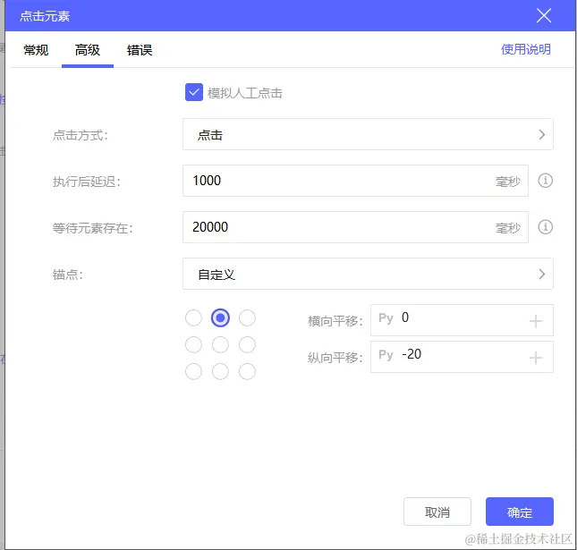 2. 搜索,并点击搜索结果进去Up主主页,这里有个需要注意的点,就是搜索结果列表,除了了【关注】按钮可以点击,其他的位置无法点击,直接点【关注】按钮又无法进入主页,所以使用了[点击元素]指令高级设置中的“点击位置”功能,点击【关注】按钮边上的位置进入主页