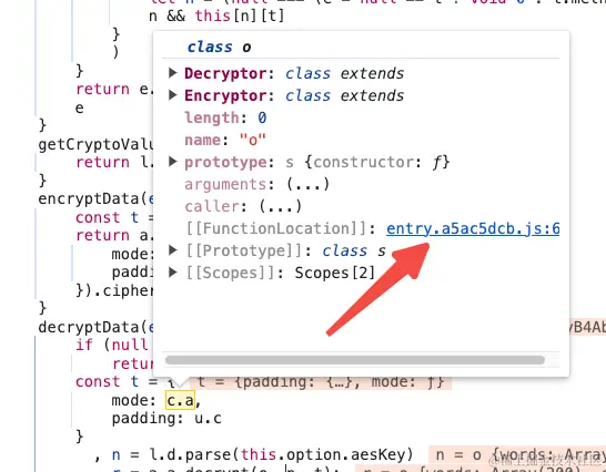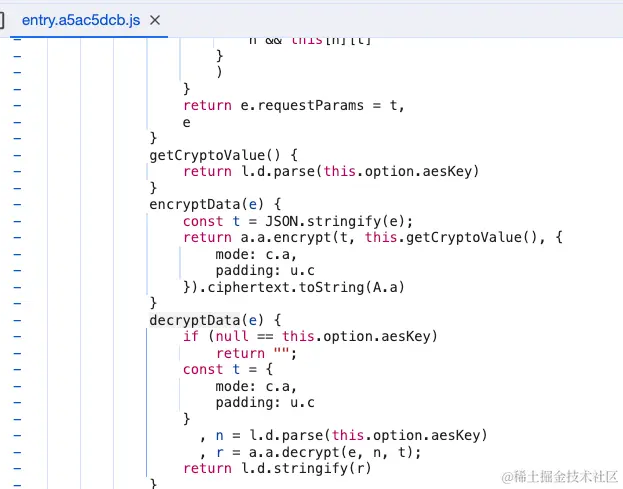 我们观察 app.js 中的 decryptData 函数,发现参数都是混淆过的,不太容易找到具体的值。但是可以看到有一个 aseKey 参数名称是没有混淆的,那么我们继续在 app.js 中搜索 aesKey,看看是否能有所发现。