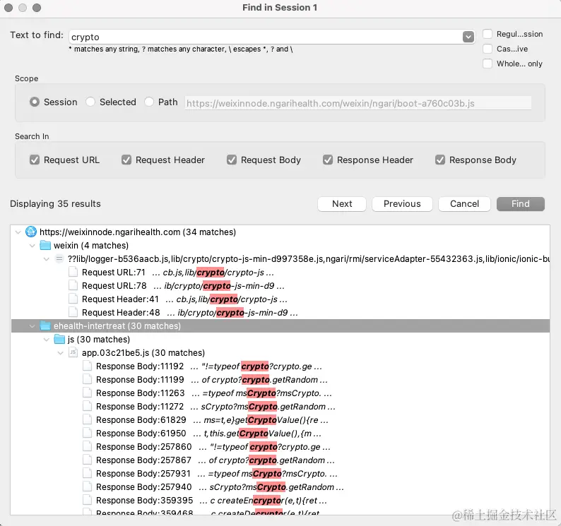 清理 charles sessions,然后重新打开公众号,可以看到多了很多请求,里面也有一些 js、css 文件了。然后在搜索中尝试输入 crypto,不要问为什么,因为经验告诉我大概率是可以搜到的。果然搜到了不少相关信息,嘿嘿~