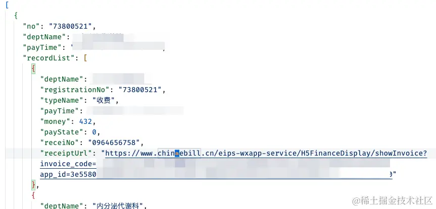 观察上一步中解析出来的数据,可以看到有一个 receiptUrl 字段非常惹眼,是一个 url,点击进去其实就是发票的地址