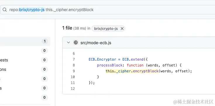 接着打开 crypto-js 的 github 仓库,搜索 "this._cipher.encryptBlock(e, t)"