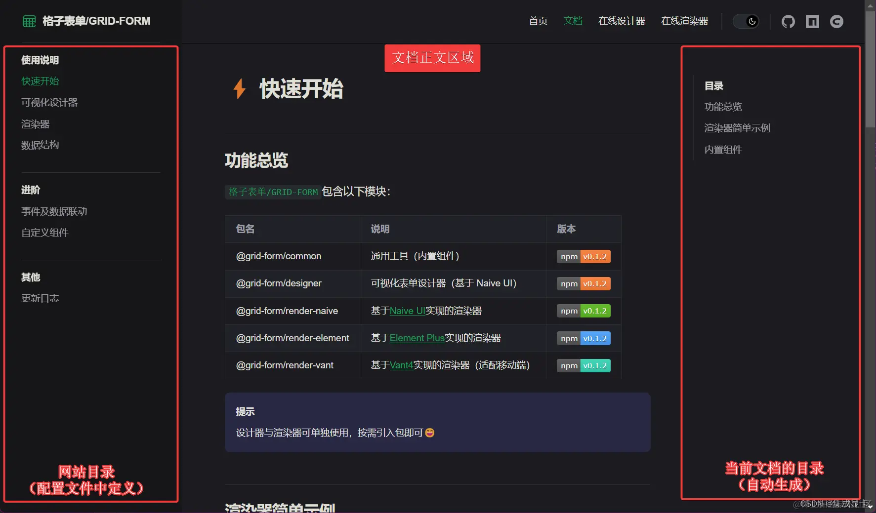 一个 md 文件默认为doc(文档)布局,在大屏下文档页呈左中右三区(见下图),中等屏幕则左中(右侧目录藏于内容顶部),移动端则是只有中间内容区域。