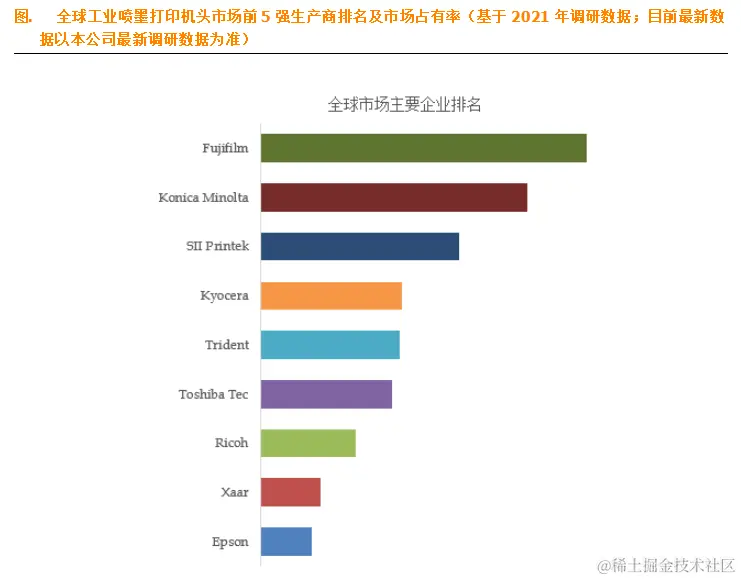 全球范围内工业喷墨打印机头生产商主要包括Fujifilm、Konica Minolta、SII Printek、Kyocera、Trident、Toshiba Tec、Ricoh、Xaar、Epson等。2021年,全球前五大厂商占有大约67.0%的市场份额。