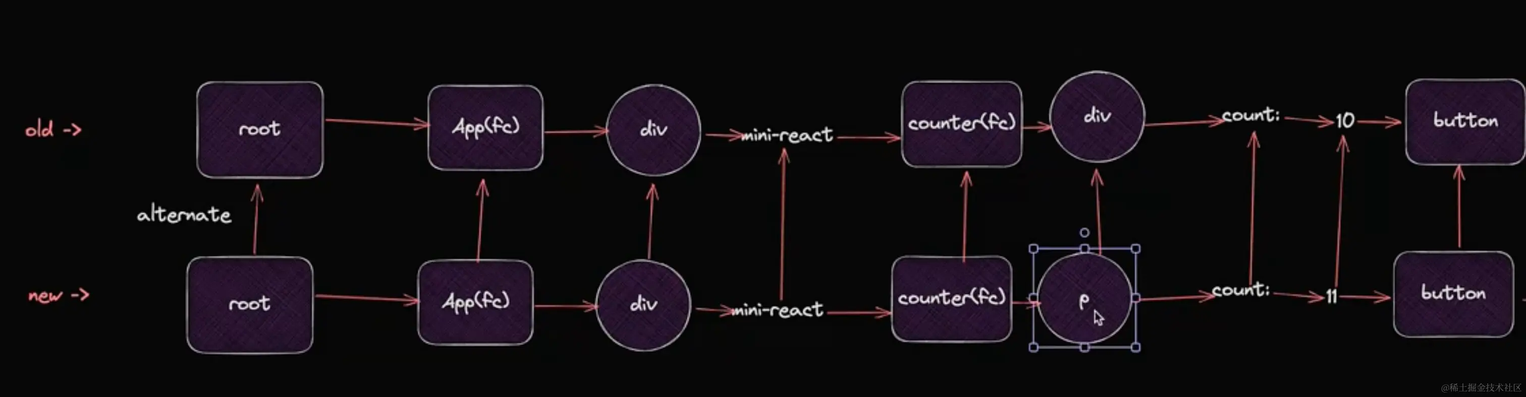 在 React 进行双树对比时,会根据 alternate 属性来找到当前的 Fiber 节点。