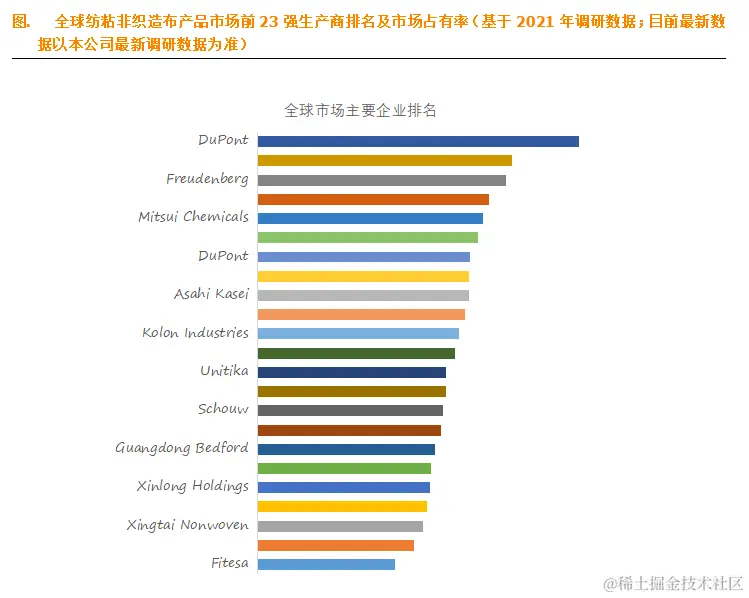 全球范围内纺粘非织造布产品生产商主要包括DuPont、Johns Manville、Freudenberg、Berry Global、Mitsui Chemicals、Toray、DuPont、Kimberly-Clark、Asahi Kasei、RadiciGroup等。2021年,全球前五大厂商占有大约104.0%的市场份额。