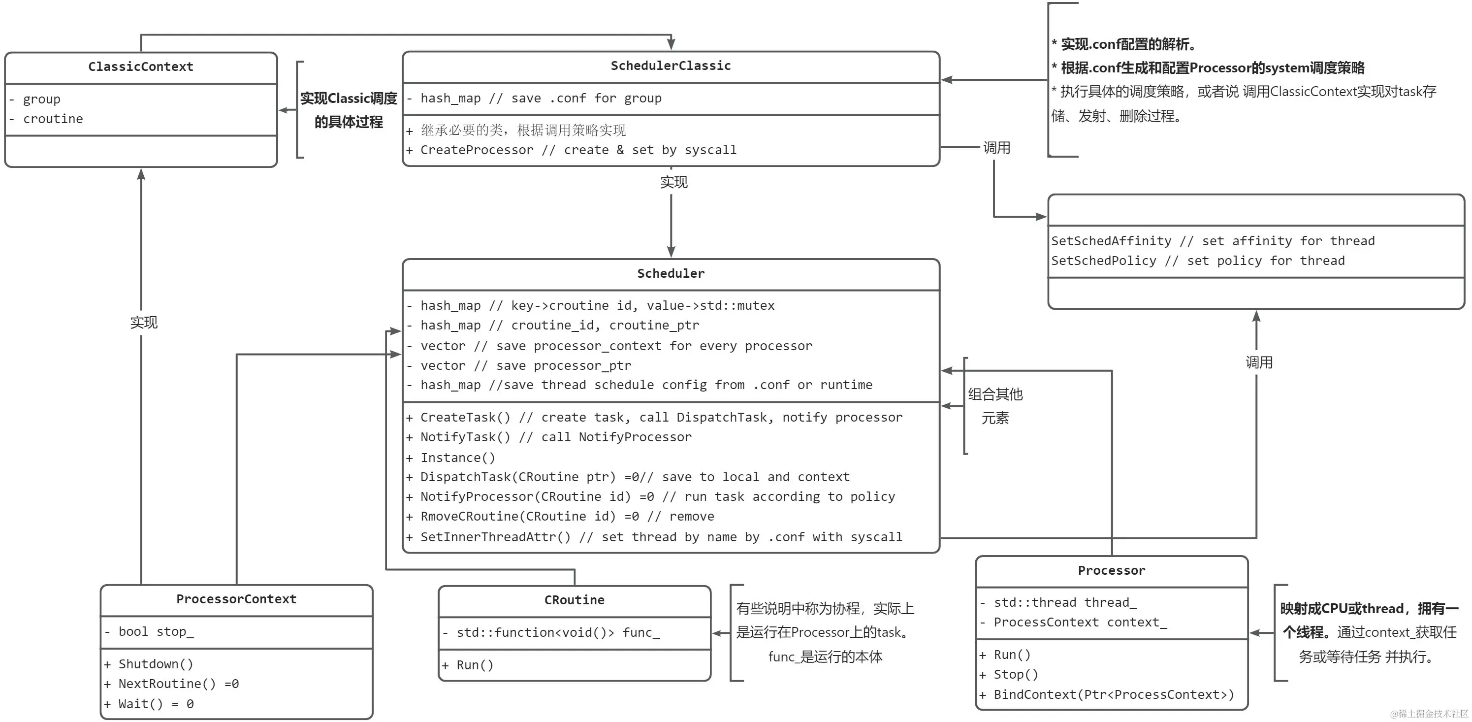话不多说,整一个框图说明类关系(先用不严谨的类图,重点标黑)。图中描述Classic调度策略的实现方式。