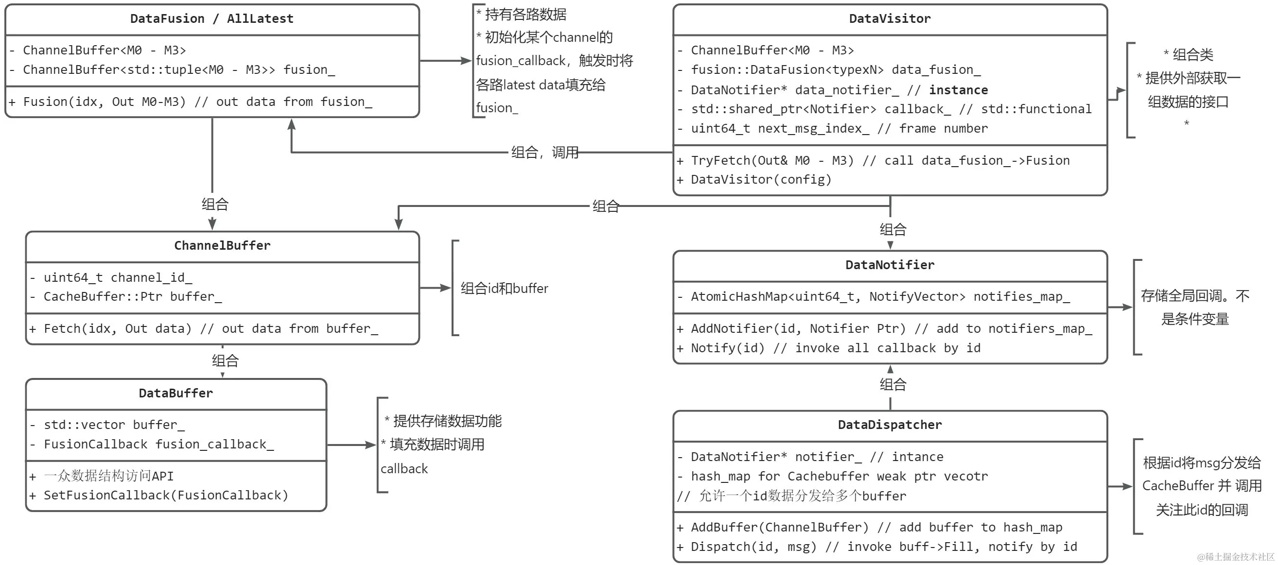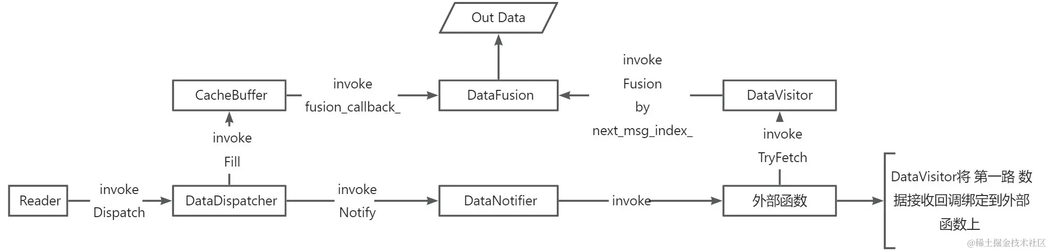 DataFusion由 DataDispather、CacheBuffer、DataVisitor三部分组成。reader(或者说subscriber)的结果通过DataDispather发送和缓存在CacheBuffer中,DataVision被事件触发将一组数据发送给具体的CRoutine。