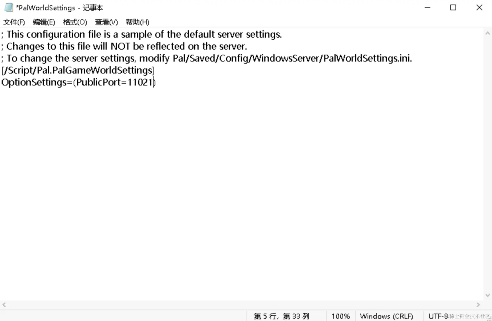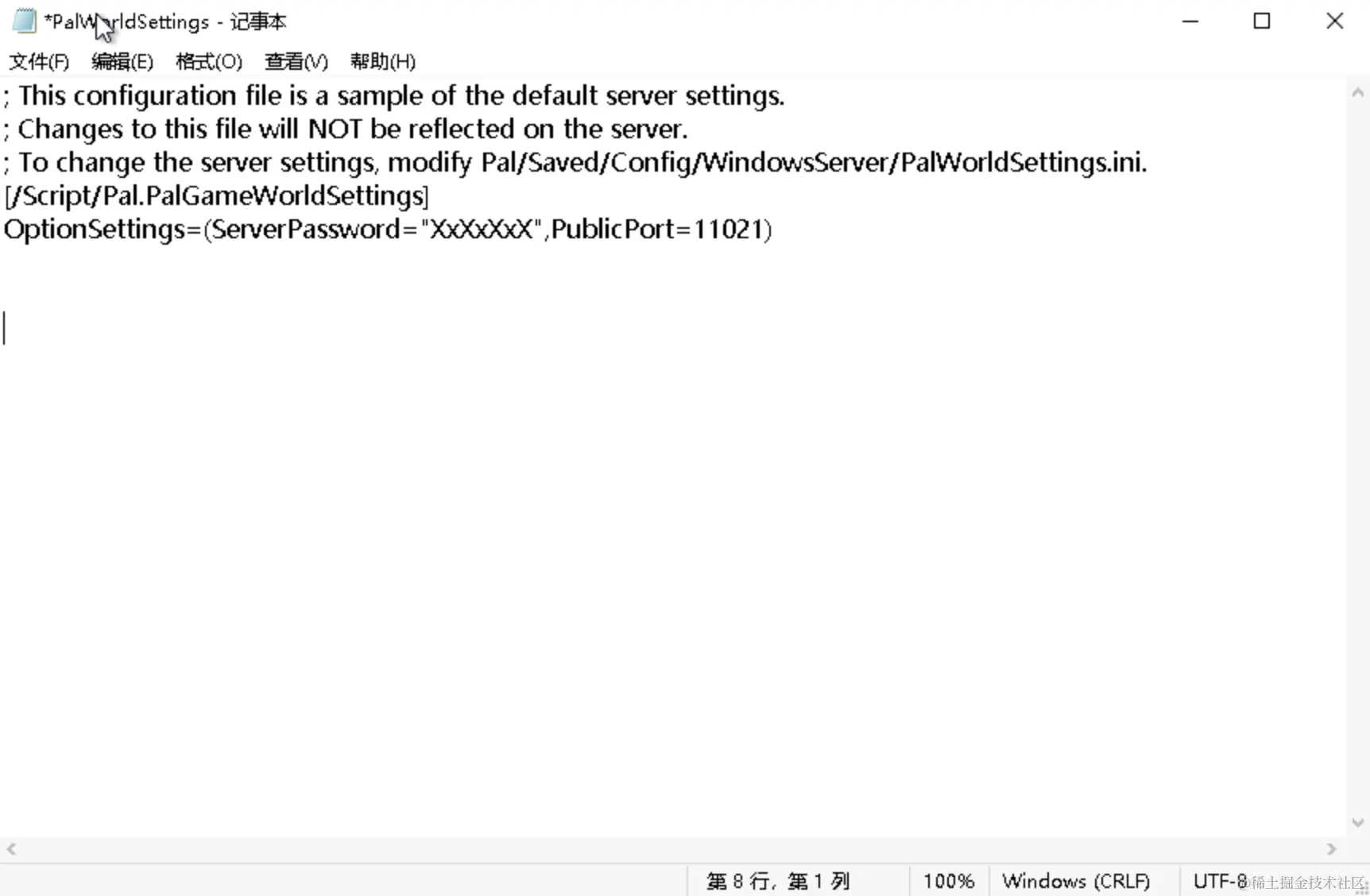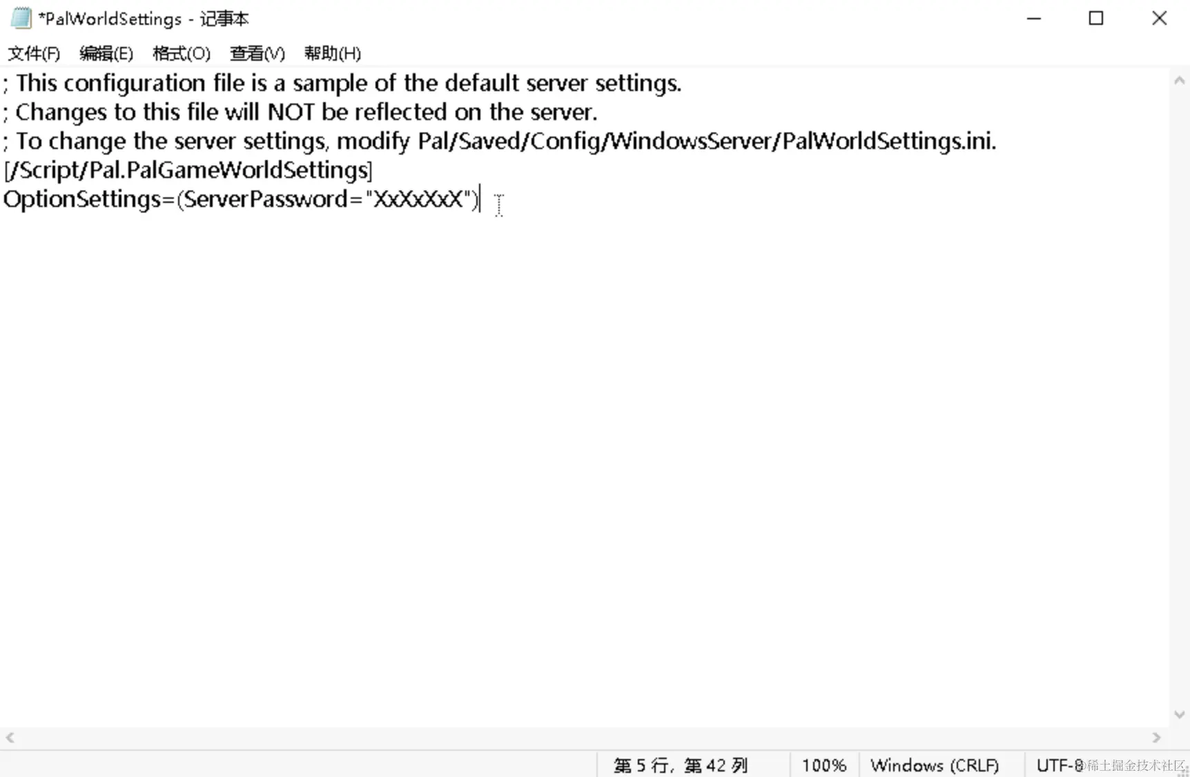 如果PalWorldSettings.ini文件为空,那么则直接添加如下内容并 Ctrl+S 保存即可: