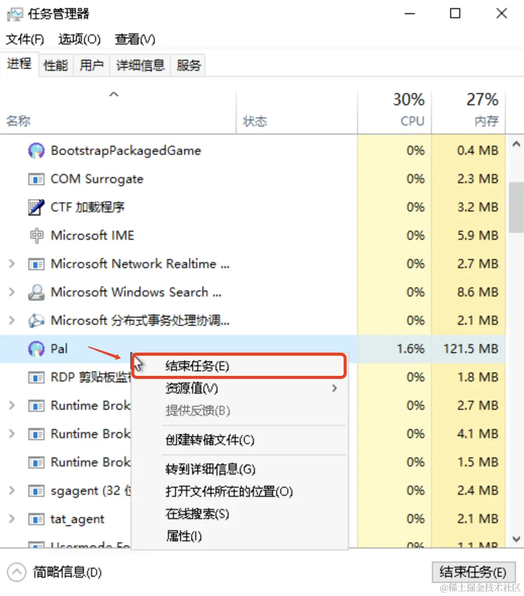 在任务管理器中找到名为“Pal”的进程,选中并右键单击,再点击“结束任务”。