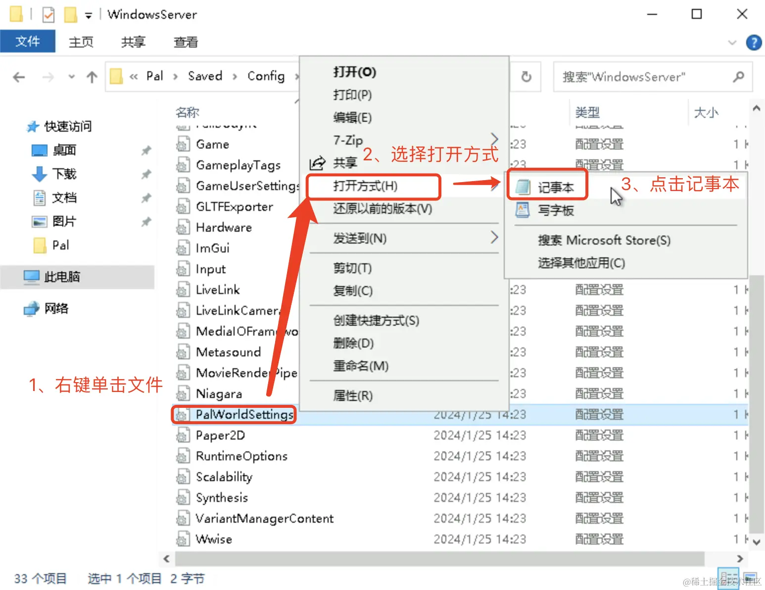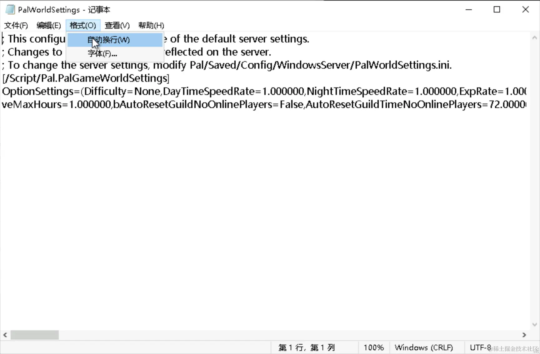 1、进入以下目录,找到幻兽帕鲁的默认配置文件:PalWorldSettings.ini,右键选择记事本打开,并在“格式”中选择“自动换行”。修改完成后按下 Ctrl+S 键进行保存。