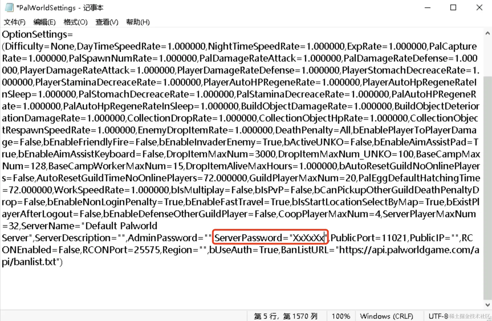 设置游戏服务器密码: 找到ServerPassword的参数,在双引号中输入你想要设置的游戏连接密码(请注意密码复杂度,不要设置得过于简单)。