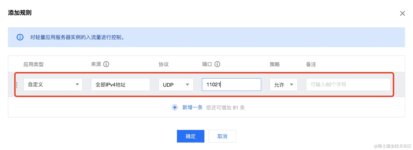 接下来,你需要放通前文在配置文件中修改的端口(UDP),即可使用“IP:端口号”继续连接游戏服务器。此处以11021为例。