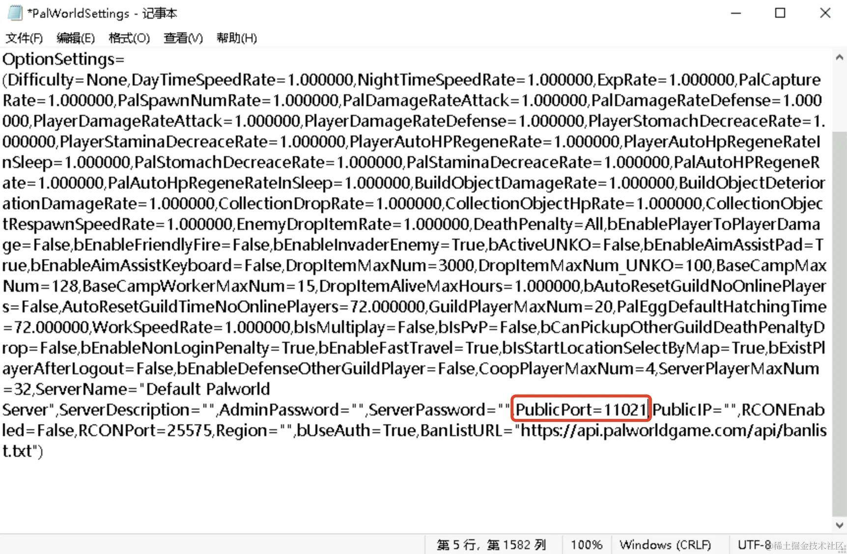修改端口: 找到PublicPort的参数,并将其中的8211修改为1-65535之中的数字(避免使用22、80、3389、3306、443等常用端口,如下图所示的11046)。修改完成后按下 Ctrl+S 键进行保存。