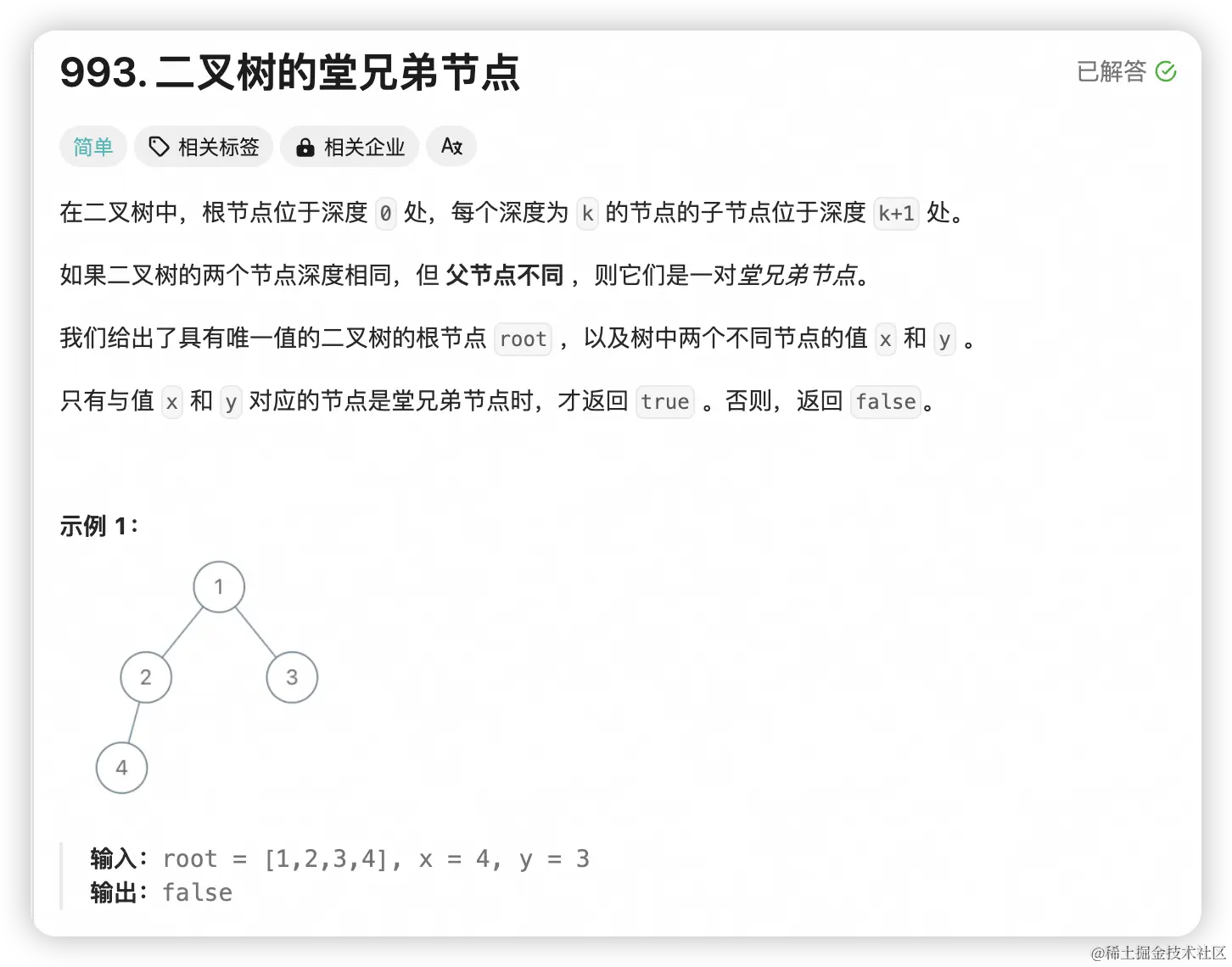在二叉树中,根节点位于深度 0 处,每个深度为 k 的节点的子节点位于深度 k+1 处。如果二叉树的两个节点深度相同,但父节点不同 ,则它们是一对_堂兄弟节点_。我们给出了具有唯一值的二叉树的根节点 root ,以及树中两个不同节点的值 x 和 y 。只有与值 x 和 y 对应的节点是堂兄弟节点时,才返回 true 。否则,返回 false。