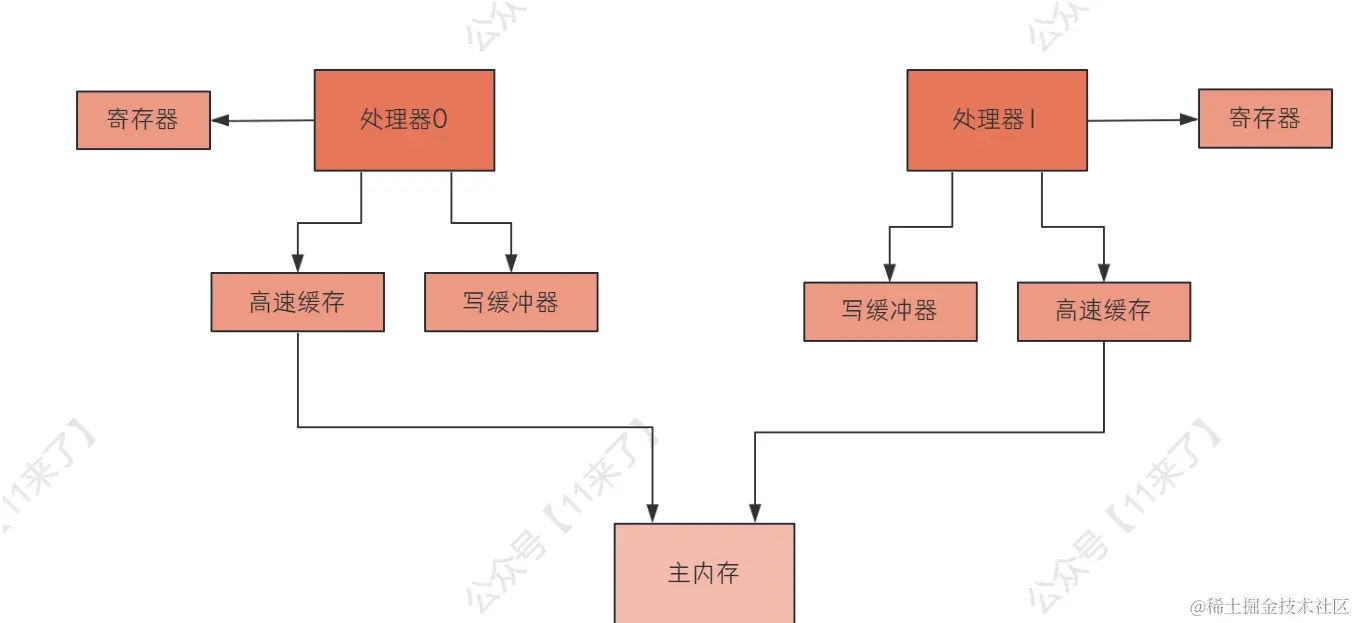 首先,每一个处理器都有自己的寄存器,而线程对变量的读操作都是针对写缓冲进行的,因此这个可见性问题与 寄存器 和 写缓冲 这两个硬件组件是有关联的