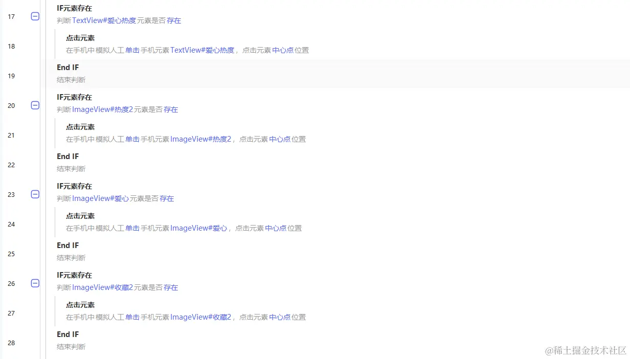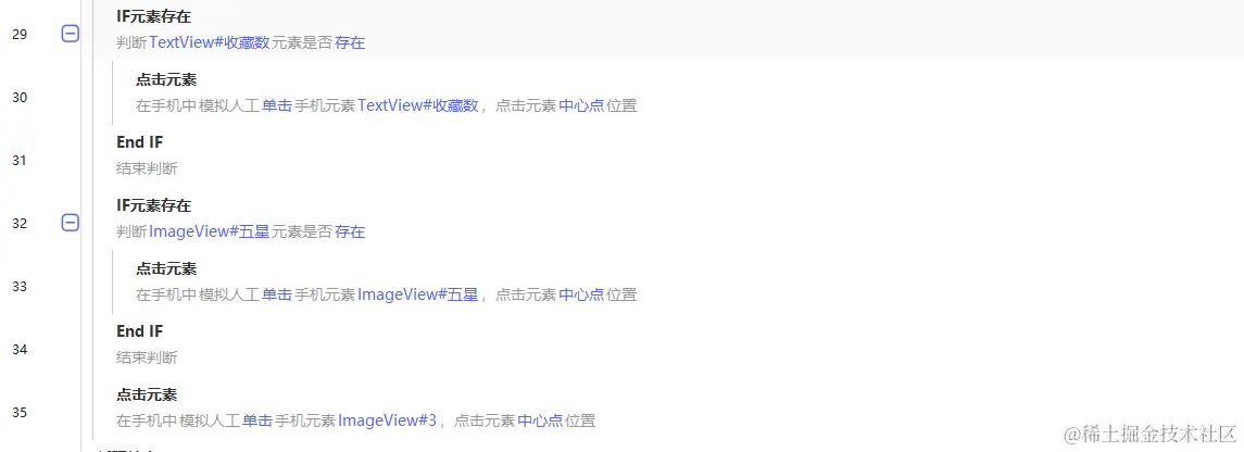 4. 进入视频页面点赞和收藏,这里需要注意的是需要点击的按钮点击前需要做下[IF元素存在],如果元素存在才点击。抖音视频的页面按钮元素变动较快,建议多找几个详情页,多抓取几个做下比较,把不同的元素都加上判断,确保按钮能点击上