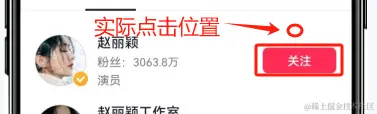 2. 搜索,并点击搜索结果进去Up主主页,这里有个需要注意的点,就是搜索结果列表,除了了【关注】按钮可以点击,其他的位置无法点击,直接点【关注】按钮又无法进入主页,所以使用了[点击元素]指令高级设置中的“点击位置”功能,点击【关注】按钮边上的位置进入主页