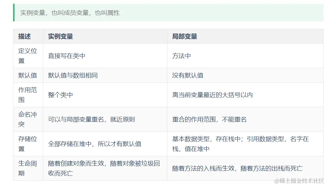 实例变量的生命周期随着对象的创建而生效,随着对象被垃圾回收而死亡,局部变量随着方法的入栈而生效,方法的出栈而死亡