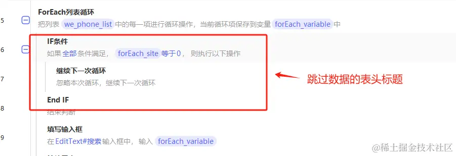 3. 使用[For each列表循环]指令循环输入手机号搜索,这里需要注意的时,从Excel直接读取的数据包含了表头,我做了判断处理,跳过表头。