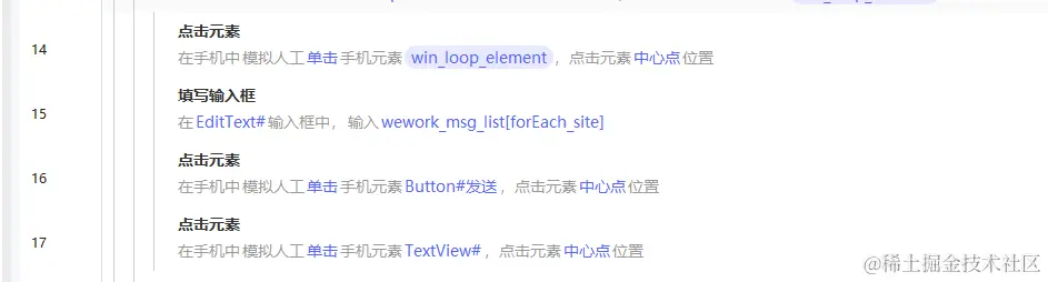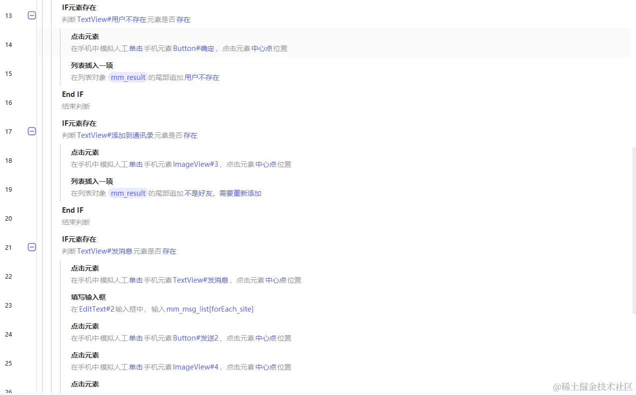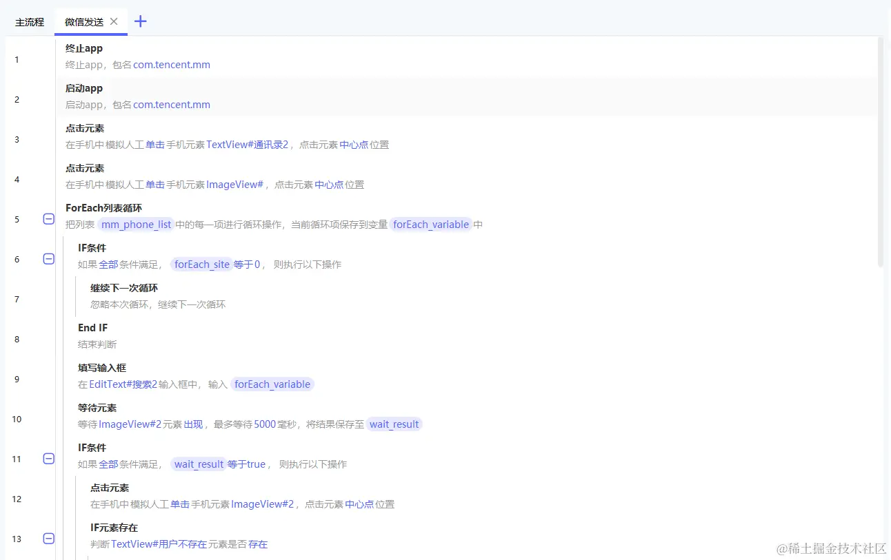 4. 点击搜索结果进入对话页面,这里有两点需要注意:一是根据手机号码可能没有搜索到对应的用户数据;二是因为企业微信能够同时添加微信好友和企业微信好友,二者手机号相同,所以同一个手机号可能会搜索到两条记录,都需要发送消息。这里分别使用了**[IF元素存在]、[IF条件]、[循环相似元素]**等指令来处理