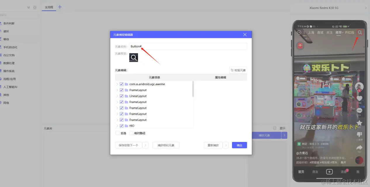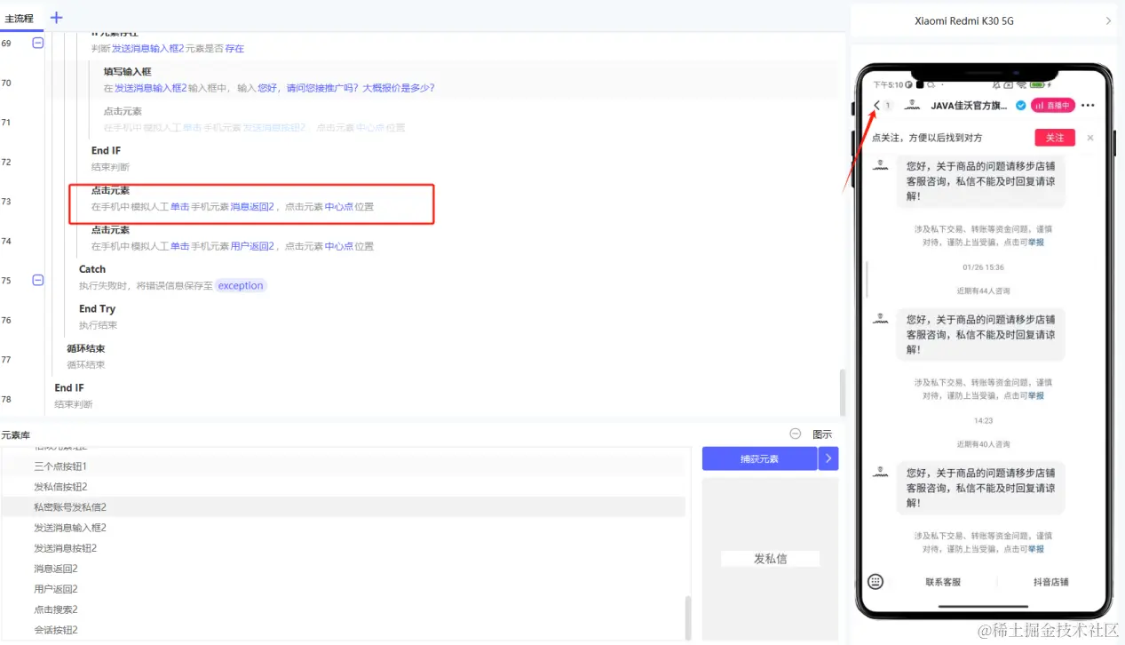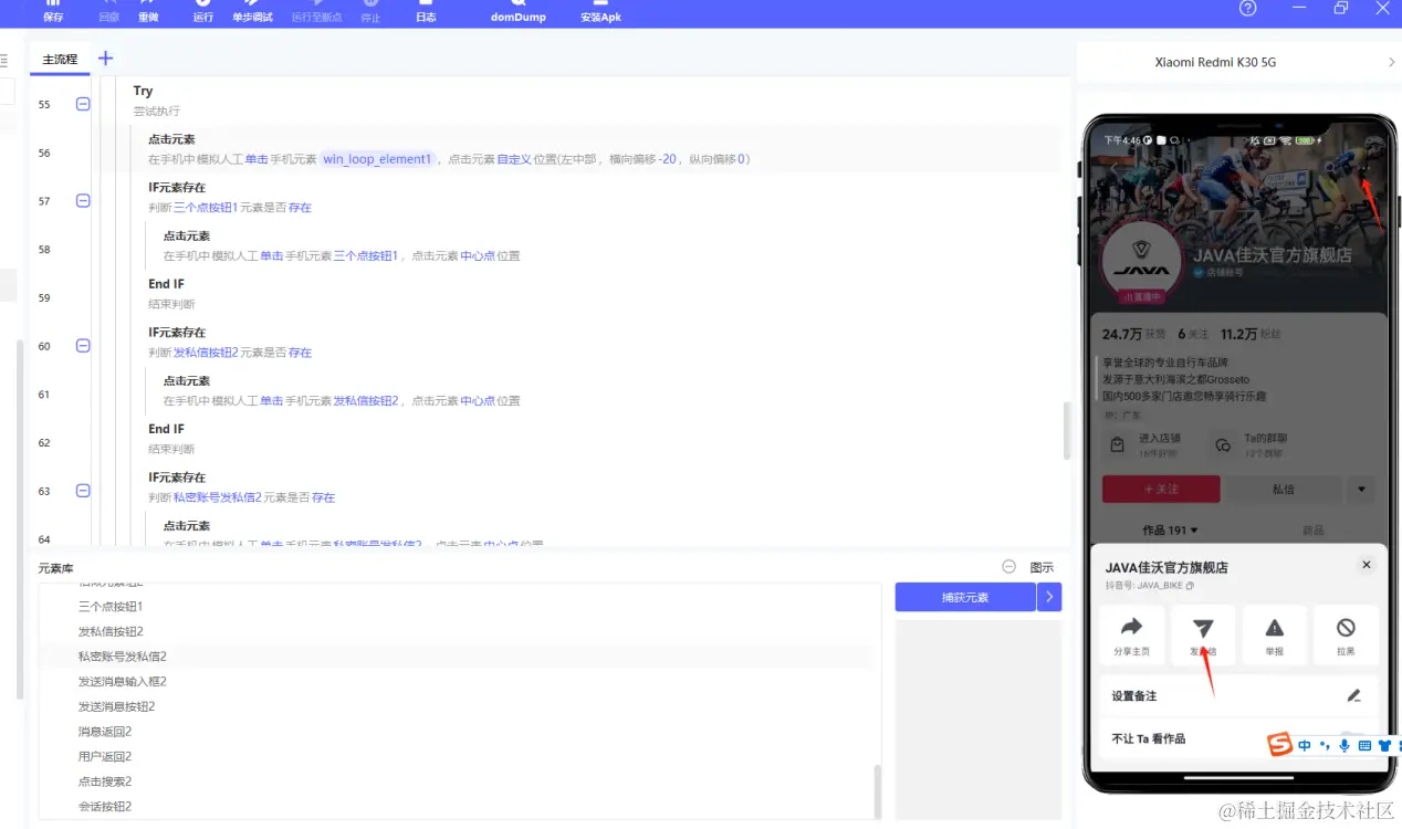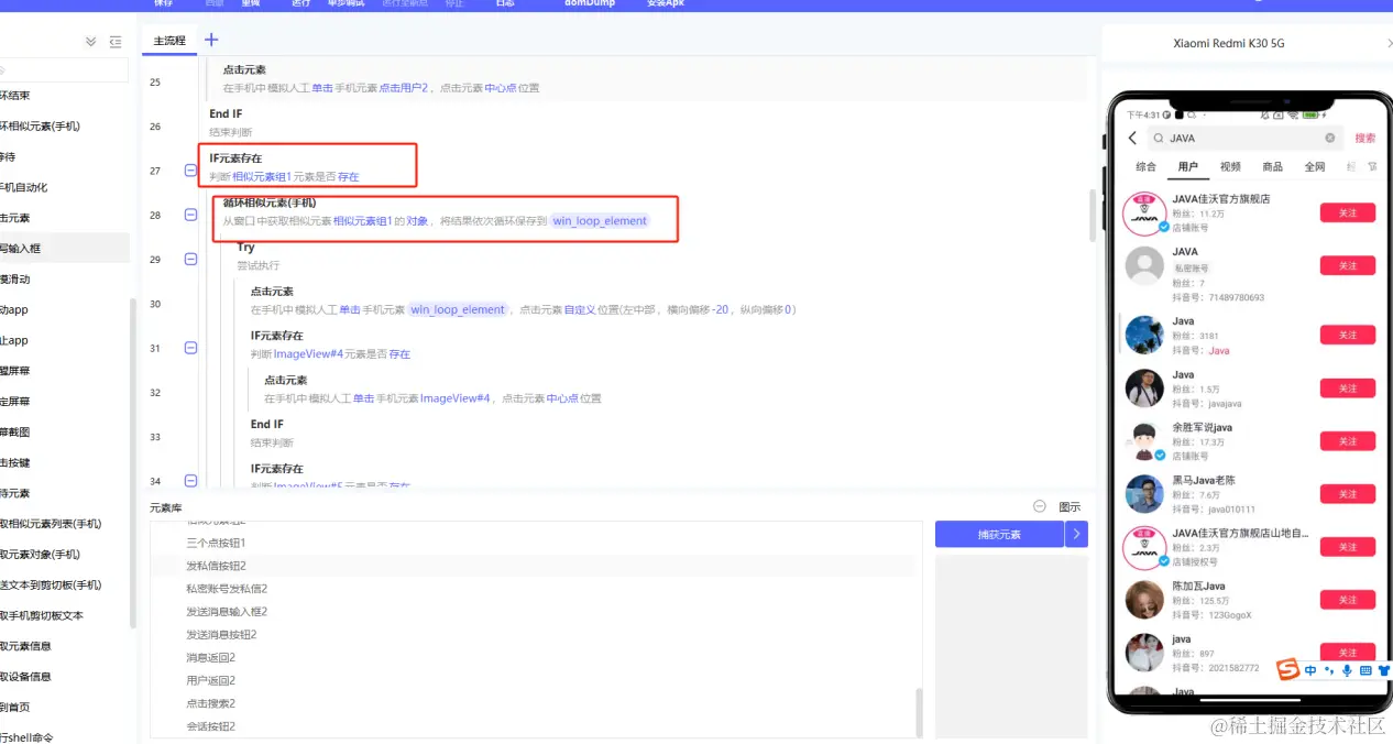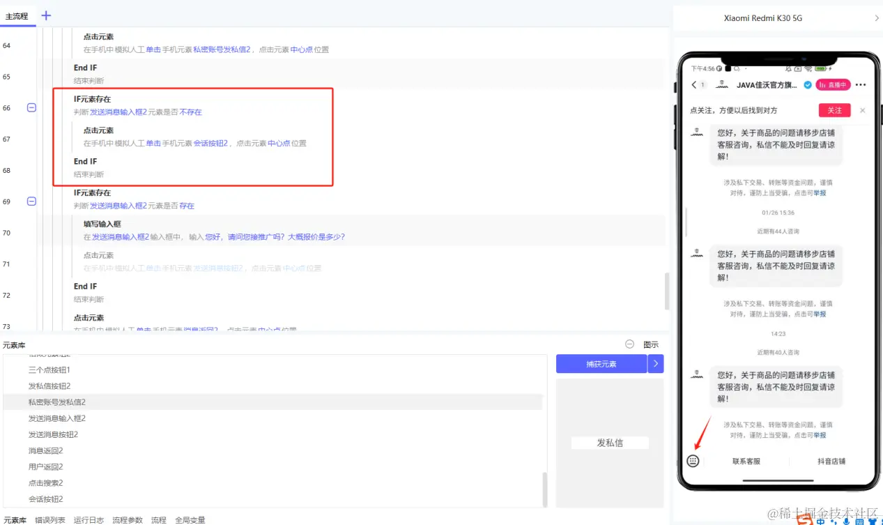5.不同手机,可能会出现捕捉的元素不存在,需要做兼容,if元素判断,保证能都在不同手机上进行运行。(本文构建应用使用的RPA客户端版本为v1.9.3)