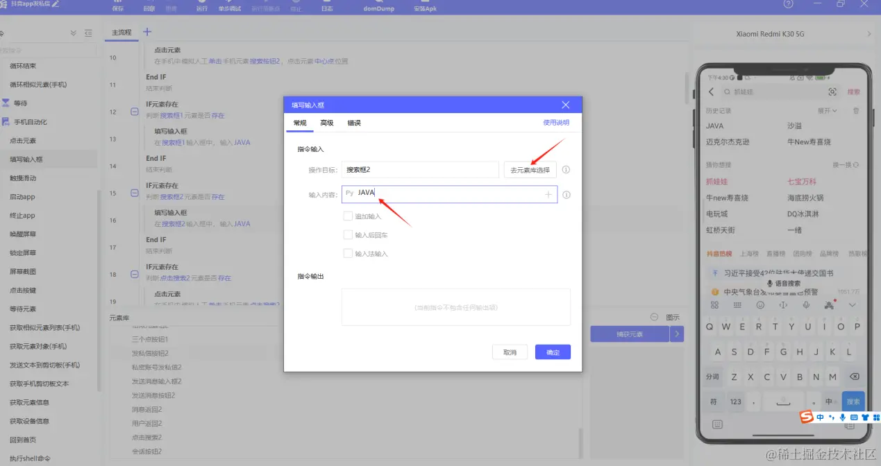 8.指令的输入如下,因为可能会出现一些弹框(获取通讯录联系人信息等),需要将其做一个判断,如果存在则点击关闭该弹框,保证能正常进行我们模拟人工的操作流程。