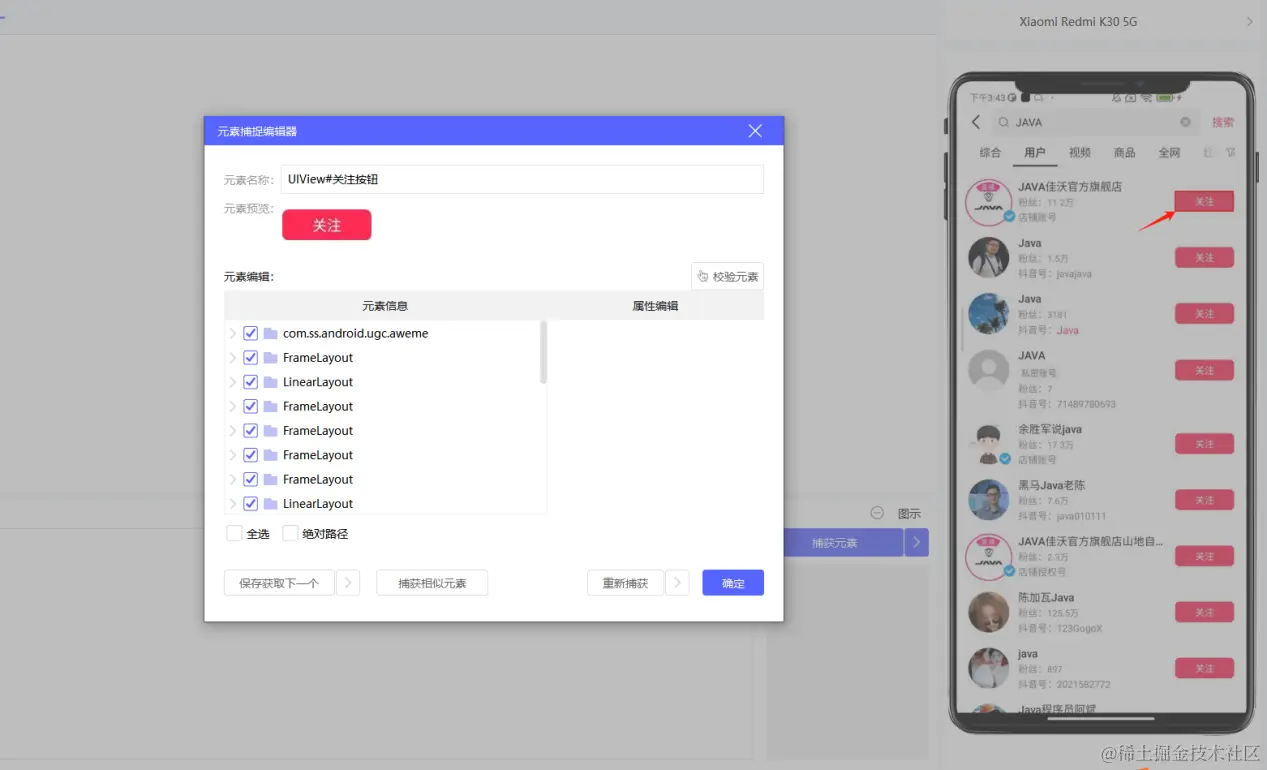 5.以此类推,将人工对某个用户发私信的每一步的操作进行元素捕获,其中对相似元素的捕获需特殊说明,比如想要捕获如下用户列表,我们发现这些用户的相似元素是右边的“关注”这个按钮,则我们对其进行第一次捕获,捕获成功。