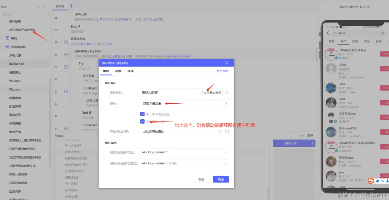 11.这里,如何对用于列表进行循环操作,点击循环相似元素,选择操作目标(之前捕捉的相似元素)如下图所示: