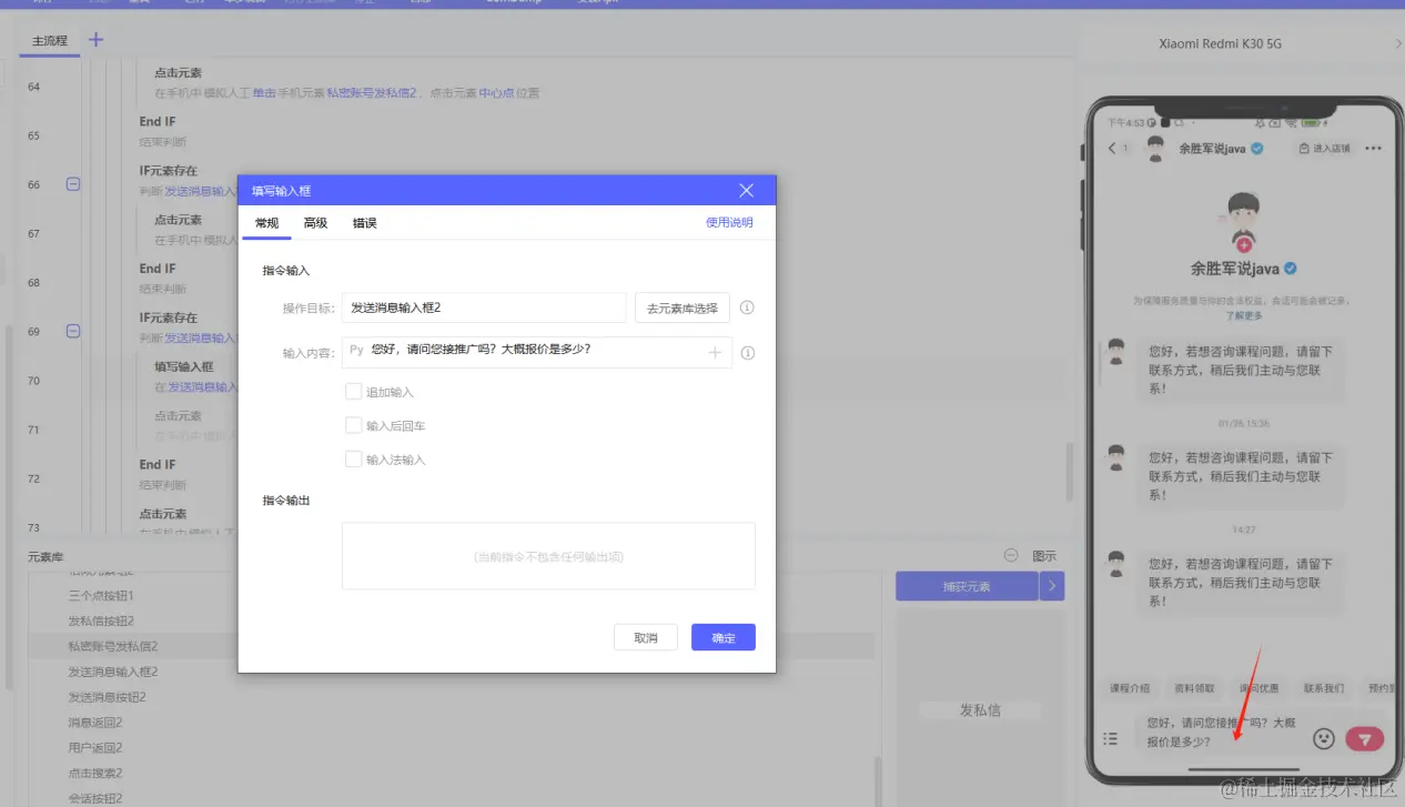 1.捕捉人工操作发私信的所有按钮和输入框元素,以及相似元素捕捉,进行重命名,以便指令输入中区分使用;