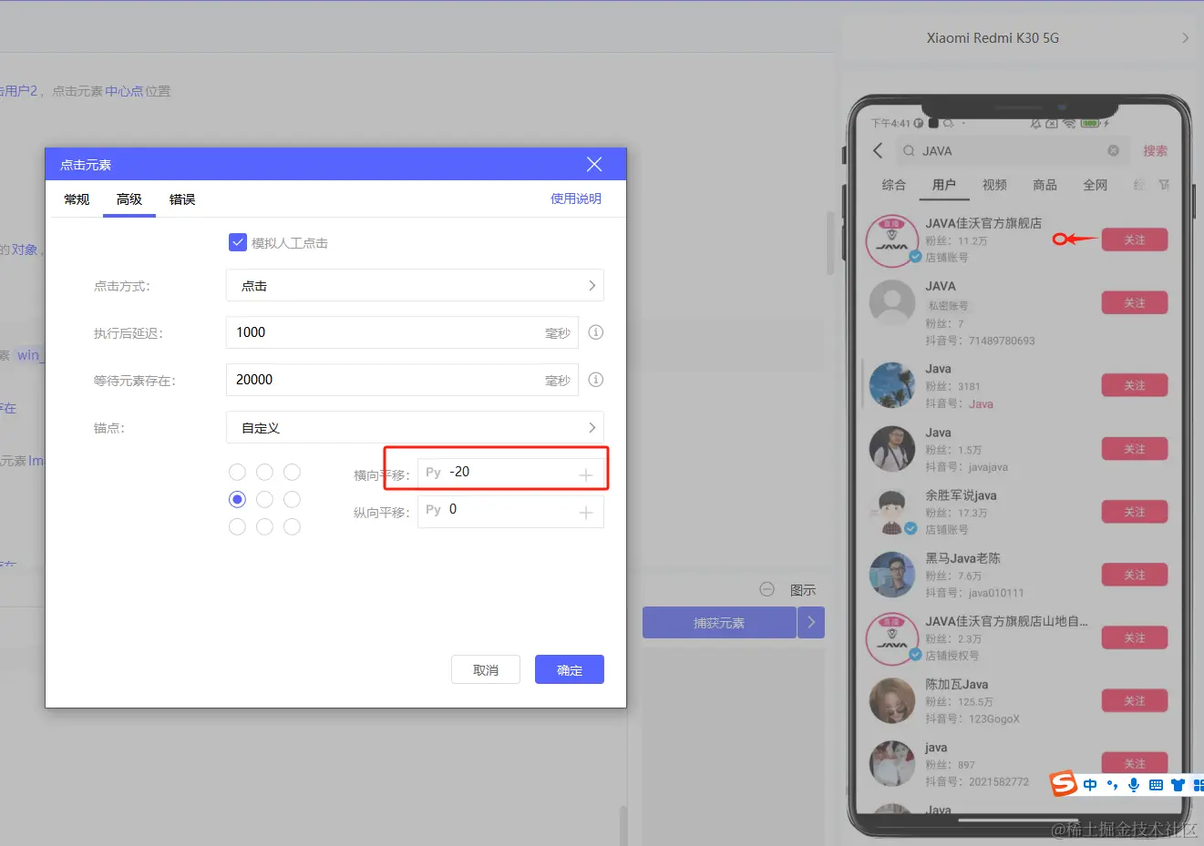 操作目标选择上一步循环相似元素写入的对象win_loop_element,点击高级,设置横向左平移20,即点击关注旁边的空白处,进入用户主页