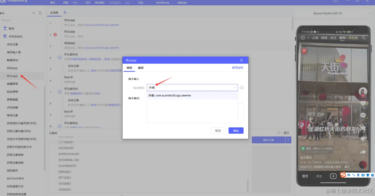 7.接下来进行指令的输入,为了保持每次app的初始状态一致,首先关闭抖音app,然后再打开抖音app