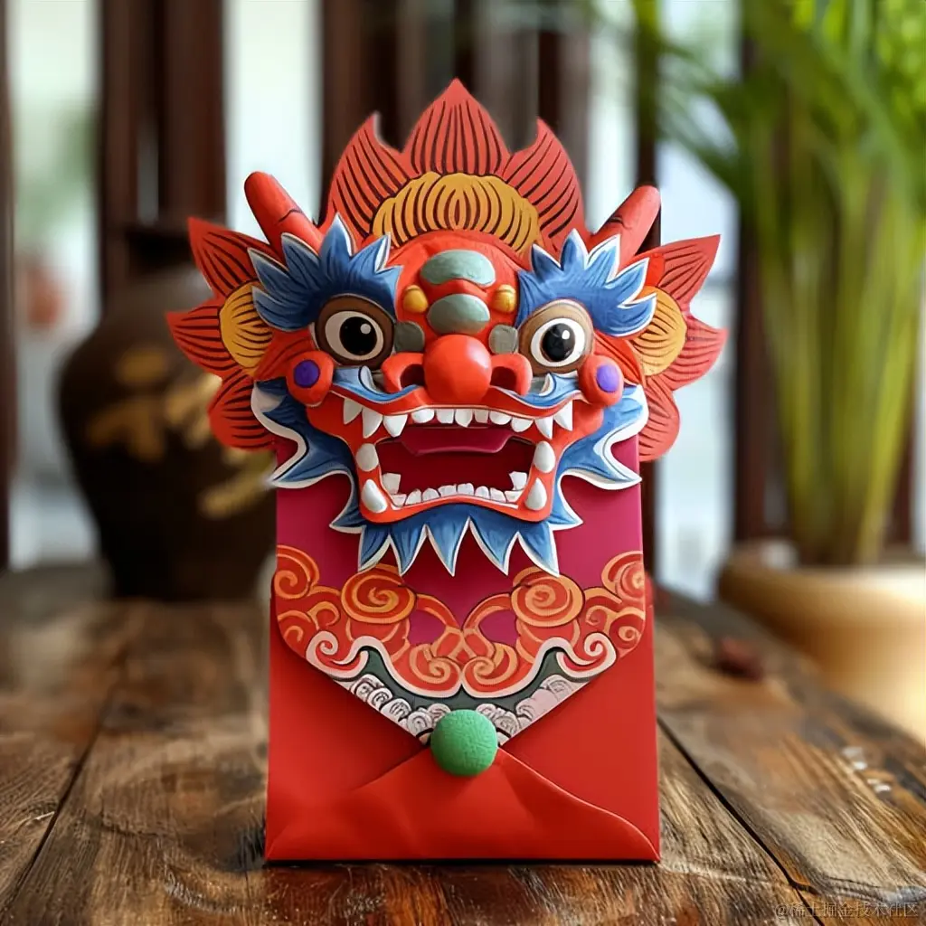 一张色彩斑斓的红包,上面绘有一只红色的中国龙,风格犹如壁画一般。这组关键词汇集了丰富的色彩和可爱的玩具雕塑风格,将路易斯·韦恩式的强烈面部表情融入其中,呈现出高品质的艺术作品。