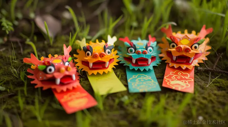 三个小龙红包铺在绿色地面上,风格丰富多彩,用纸板制成,面部表情强烈,中国朋克风格,具有明亮的质感,玩具风(toyen),王子核心(princecore)。