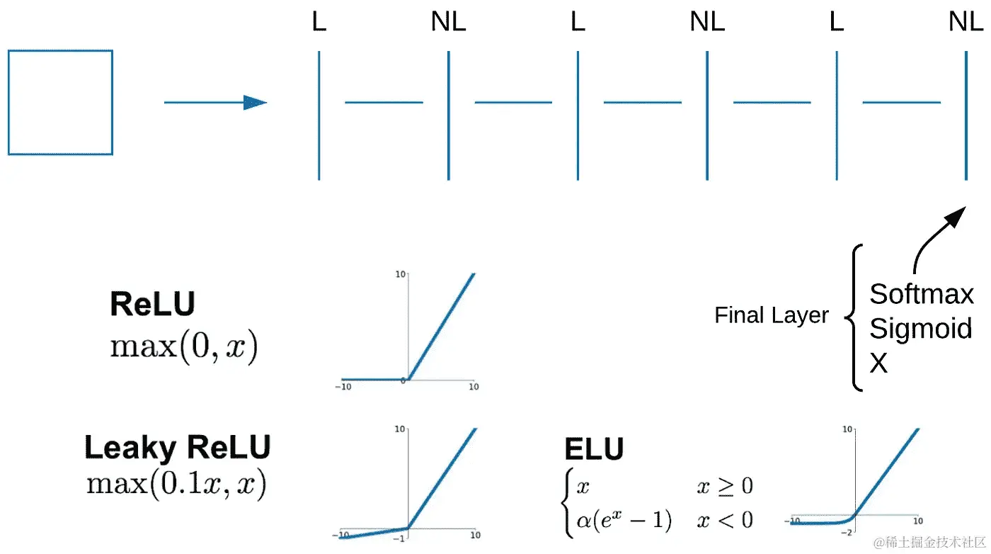 问题:所以我想我听到你说有几种不同的激活函数,比如修正线性单元。有一些例子,为什么会使用每一个呢?是的,很好的问题。所以基本上当你添加更多的线性层时,你的输入进来,你把它通过一个线性层然后一个非线性层,线性层,非线性层,线性层和最终的非线性层。最终的非线性层正如我们讨论过的,如果它是多类别分类但你只选择其中一个,你会使用 softmax。如果是二元分类或多标签分类,你会使用 sigmoid。如果是回归,通常你根本不会有,尽管我们在昨晚的深度学习课程中学到有时你也可以在那里使用 sigmoid。所以它们基本上是最终层的主要选项。对于隐藏层,你几乎总是使用 ReLU,但还有另一个你可以选择的,有点有趣,叫做 leaky ReLU。基本上如果它大于零,它是y = x,如果小于零,它就像y = 0.1x。所以它与 ReLU 非常相似,但不是等于 0,而是接近于 0。所以它们是主要的两种:ReLU 和 Leaky ReLU。