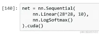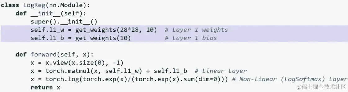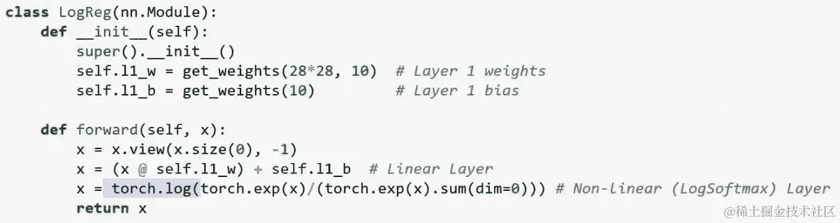 所以这就是全部。PyTorch 也倾向于使用 softmax 的对数,原因并不需要现在困扰我们。基本上是为了数值稳定性的便利。因此,为了使这与我们在上面看到的nn.LogSoftmax()版本相同,我也将在这里使用对数。好的,现在我们可以实例化这个类(即创建这个类的对象)。
