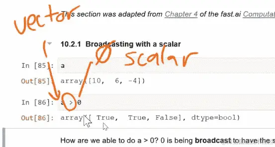 现在你可能已经做了一千次,甚至没有注意到这有点奇怪。你有不同等级和不同大小的这些东西。那么它实际上在做什么呢?它实际上是将那个标量复制 3 次(即[0, 0, 0]),并实际上逐个元素地给我们三个答案。这就是所谓的广播。广播意味着复制我的张量的一个或多个轴,以使其与另一个张量的形状相同。但它实际上并没有复制。它实际上是存储了一种内部指示器,告诉它假装这是一个三个零的向量,但实际上它不是去下一行或下一个标量,而是回到它来的地方。如果你对这个特别感兴趣,它们将该轴上的步幅设置为零。这对于那些好奇的人来说是一个较为高级的概念。