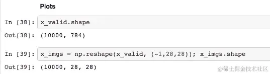 为了显示它,我想将它转换为一个 28x28 的秩为 2 的张量。Numpy 有一个 reshape 函数,它接受一个张量并将其重塑为你请求的任何大小的张量。现在如果你考虑一下,你只需要告诉它有D个轴,你只需要告诉它你想要的D-1个轴,因为最后一个,它可以自己算出来。所以总共,这里一共有 10,000 乘以 784 个数字。所以如果你说我希望我的最后一个轴是 28x28,那么你可以算出(第一个轴)这必须是 10,000,否则它就不会适合。所以如果你放-1,它会说让它尽可能大或尽可能小以使其适合。所以你可以看到,它算出来必须是 10,000。你会看到这种方法在神经网络软件的预处理中经常使用。我可以在这里写 10,000,但我试图养成一种习惯,就是每当我提到输入中有多少项时,我倾向于使用-1,因为这意味着以后我可以使用子样本,这段代码不会出错。如果它是不平衡的,我可以进行一些分层抽样,这段代码不会出错。所以通过在这里使用-1 这种大小,它使得以后的更改更具弹性。这是一个很好的习惯。