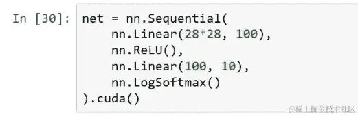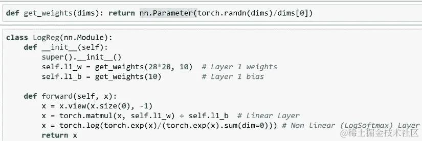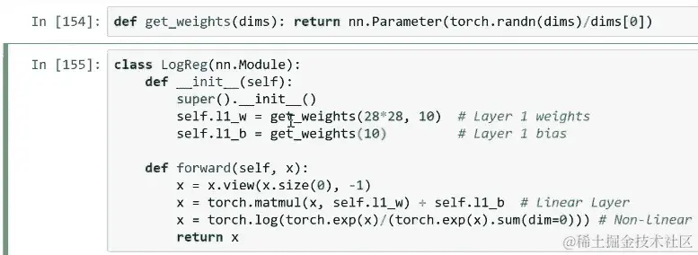 现在我们已经得到了这个,我们可以实例化该类的一个对象[27:30]。当然我们想将其复制到 GPU 上。这样我们可以在那里进行计算。再次,我们需要一个优化器,我们很快会讨论这是什么。但你看到这里,我们在我们的类上调用了一个名为parameters的函数。但我们从未定义过一个叫做 parameters 的方法,这将会起作用的原因是因为它实际上是在nn.Module内部为我们定义的。所以nn.Module会自动遍历我们创建的属性,并找到任何我们说这是一个参数的东西。你说某个东西是参数的方式是将它包装在nn.Parameter中。这只是告诉 PyTorch 这是我想要优化的东西的方式。所以当我们创建权重矩阵时,我们只是用nn.Parameter包装它,这与我们很快要学习的常规 PyTorch 变量完全相同。这只是一个小标志,告诉 PyTorch 你应该优化这个。所以当你在我们创建的net2对象上调用net2.parameters()时,它会遍历我们在构造函数中创建的所有东西,检查是否有任何一个是Parameter类型,如果是,它会将所有这些东西设置为我们要用优化器训练的东西。我们稍后将从头开始实现优化器。
