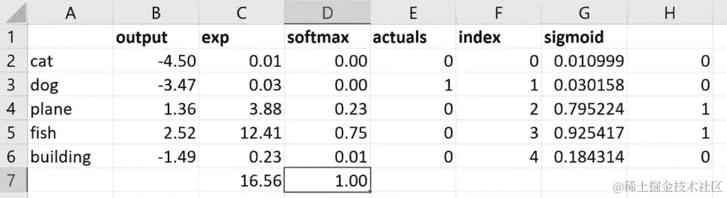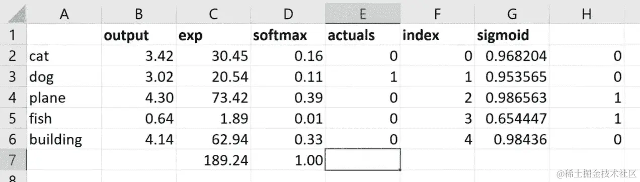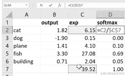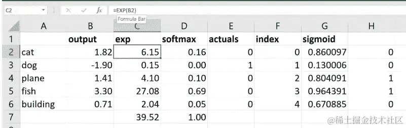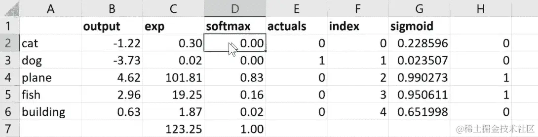 问题:我有一个关于之前的概率的问题。如果我们有一张照片上有一只猫和一只狗,那会改变它的工作方式吗?或者它的基本工作方式是一样的。这是一个很好的问题。所以如果你有一张照片上有一只猫和一只狗,你希望它同时输出猫和狗,这将是一个非常糟糕的选择。Softmax 是我们专门用于分类预测的激活函数,我们只想预测其中一种东西。因此,部分原因是因为正如你所看到的,因为我们使用e的幂,稍微更大的e会产生更大的数字。因此,通常我们只有一两个大的东西,其他东西都很小。因此,如果我重新计算这些随机数(在 Excel 表中),你会看到它往往是一堆零和一两个高数字。因此,它真的是设计成试图让预测这一件事变得容易。如果你正在进行多标签预测,所以我只想找到这张图片中的所有东西,而不是使用 softmax,我们将使用 sigmoid。Sigmoid 会导致这些东西中的每一个都在 0 和 1 之间,但它们不再加起来等于 1。