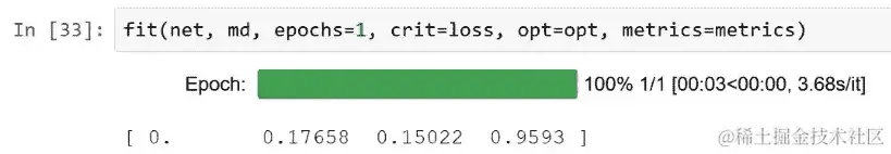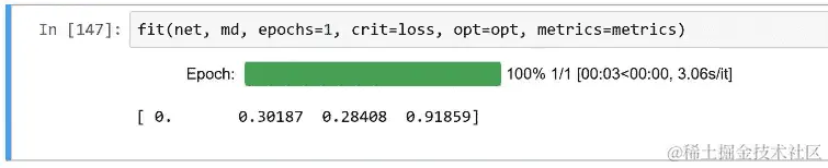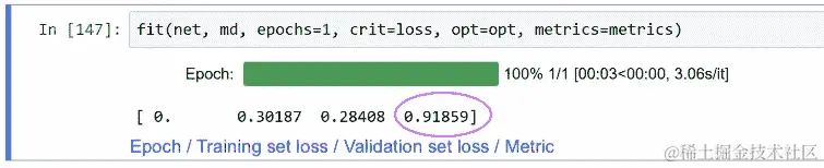 现在我们有了一个可以传递我们的变量并得到一些预测的网络,这基本上就是我们调用fit时发生的事情。所以我们将看看这种方法如何用于创建这种随机梯度下降。需要注意的一件事是将预测的概率转换为预测的数字是,我们需要使用 argmax。不幸的是,PyTorch 并不称之为 argmax。相反,PyTorch 只是称之为 max,并且 max 返回两个东西:它返回给定轴上的实际最大值(所以max(1)将返回列的最大值),它返回的第二件事是该最大值的索引。所以 argmax 的等价物是调用 max 然后获取第一个索引的东西: