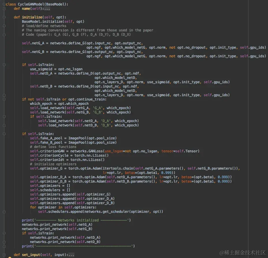 这是我们的CycleGANModel。CycleGANModel中有相当多的内容,所以让我们逐步找出将要使用的内容。在这个阶段,我们只是调用了初始化器,所以当我们初始化它时,它将会定义两个生成器,一个用于我们的马,一个用于斑马。它有一种方法来生成一组假数据,然后我们将获取我们的 GAN 损失,正如我们所讨论的,我们的循环一致性损失是一个 L1 损失。他们将使用 Adam,显然对于循环 GAN,他们发现 Adam 效果很好。然后我们将为我们的马判别器、斑马判别器和生成器各自创建一个优化器。生成器的优化器将包含马生成器和斑马生成器的参数,所有这些都在一个地方。