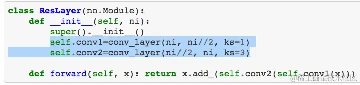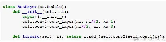 问题:为什么LeakyReLU中要使用inplace=True?谢谢你的提问!很多人忘记了这一点或者不知道这一点,但这是一个非常重要的内存技巧。如果你想一下,这个conv_layer,它是最底层的东西,所以基本上我们的 ResNet 一旦全部组装起来,就会有很多conv_layer。如果你没有inplace=True,它会为 ReLU 的输出创建一个完全独立的内存块,这样就会分配一大堆完全不必要的内存。另一个例子是ResLayer中的原始forward看起来像这样: