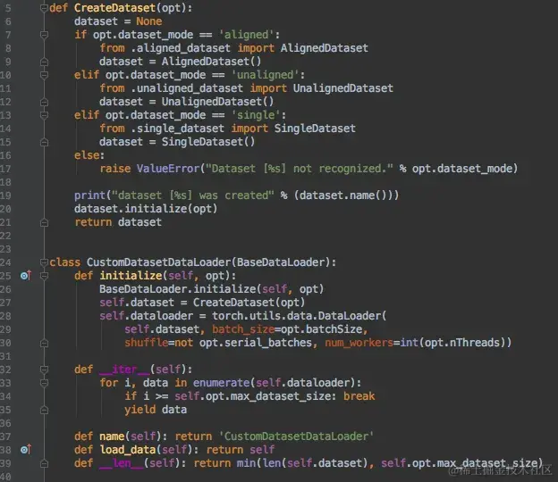 我们首先需要的是一个数据加载器。这也是一个很好的机会,让你再次练习使用你选择的编辑器或 IDE 浏览代码的能力。我们将从CreateDataLoader开始。你应该能够找到符号或在 vim 标签中直接跳转到CreateDataLoader,我们可以看到它创建了一个CustomDatasetDataLoader。然后我们可以看到CustomDatasetDataLoader是一个BaseDataLoader。我们可以看到它将使用标准的 PyTorch DataLoader,这很好。我们知道如果要使用标准的 PyTorch DataLoader,你需要传递一个数据集,我们知道数据集是包含长度和索引器的东西,所以当我们查看CreateDataset时,它应该会这样做。