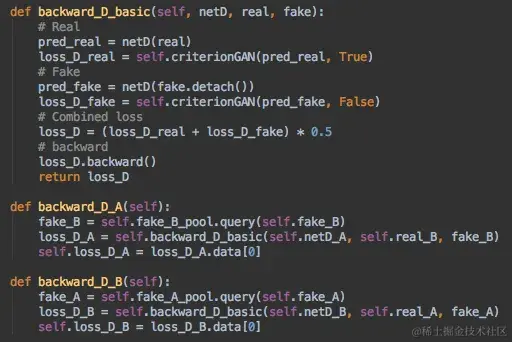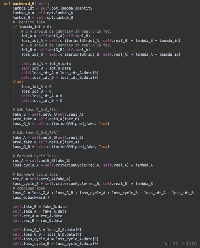 这里是[2:12:04]。让我们跳到关键部分。这里有我们刚刚在论文中看到的所有公式。让我们拿一匹马生成一只斑马。现在让我们使用鉴别器来看看我们是否能够判断它是假的还是真的(pred_fake)。然后让我们将其放入我们之前设置的损失函数中,以基于该预测获得 GAN 损失。然后让我们以相反的方向做同样的事情,使用相反的鉴别器,然后再次通过损失函数。然后让我们做循环一致性损失。再次,我们拿我们创建的假的东西,尝试将其转回原始状态。让我们使用之前创建的循环一致性损失函数将其与真实原始状态进行比较。这里是那个 lambda - 所以有一些权重我们使用了,实际上我们只是使用了他们在选项中建议的默认值。然后对相反的方向做同样的事情,然后将它们全部加在一起。然后进行反向步骤。就是这样。
