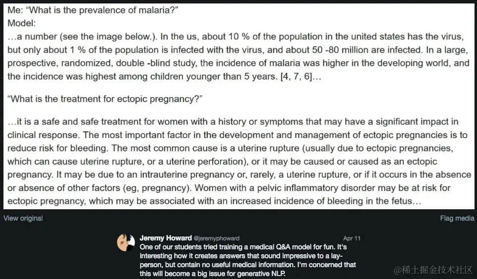 Jeremy 发现这个有趣的地方是,对于没有医学硕士学位的人来说,这几乎是一个可信的答案。但它与现实完全没有关系。他认为这是一种有趣的伦理和用户体验困境。Jeremy 参与了一个名为 doc.ai 的公司,该公司试图做很多事情,但最终提供一个应用程序供医生和患者使用,可以帮助他们解决医疗问题。他一直在对团队中的软件工程师说,请不要尝试使用 LSTM 或其他东西创建生成模型,因为它们会擅长创造听起来令人印象深刻但实际上是错误建议的东西 —— 就像政治评论员或终身教授可以以极大的权威说废话一样。所以他认为这是一个非常有趣的实验。如果你做了一些有趣的实验,请在论坛、博客、Twitter 上分享。让人们知道并受到了了不起的人的关注。