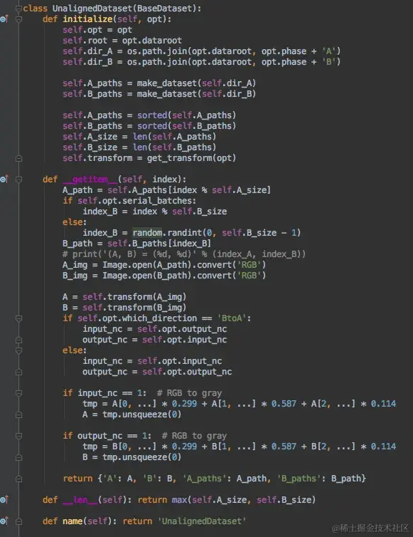 正如预期的那样,它有__getitem__和__len__。对于长度,A 和 B 是我们的马和斑马,我们有两组,所以较长的那个将是DataLoader的长度。__getitem__将会: