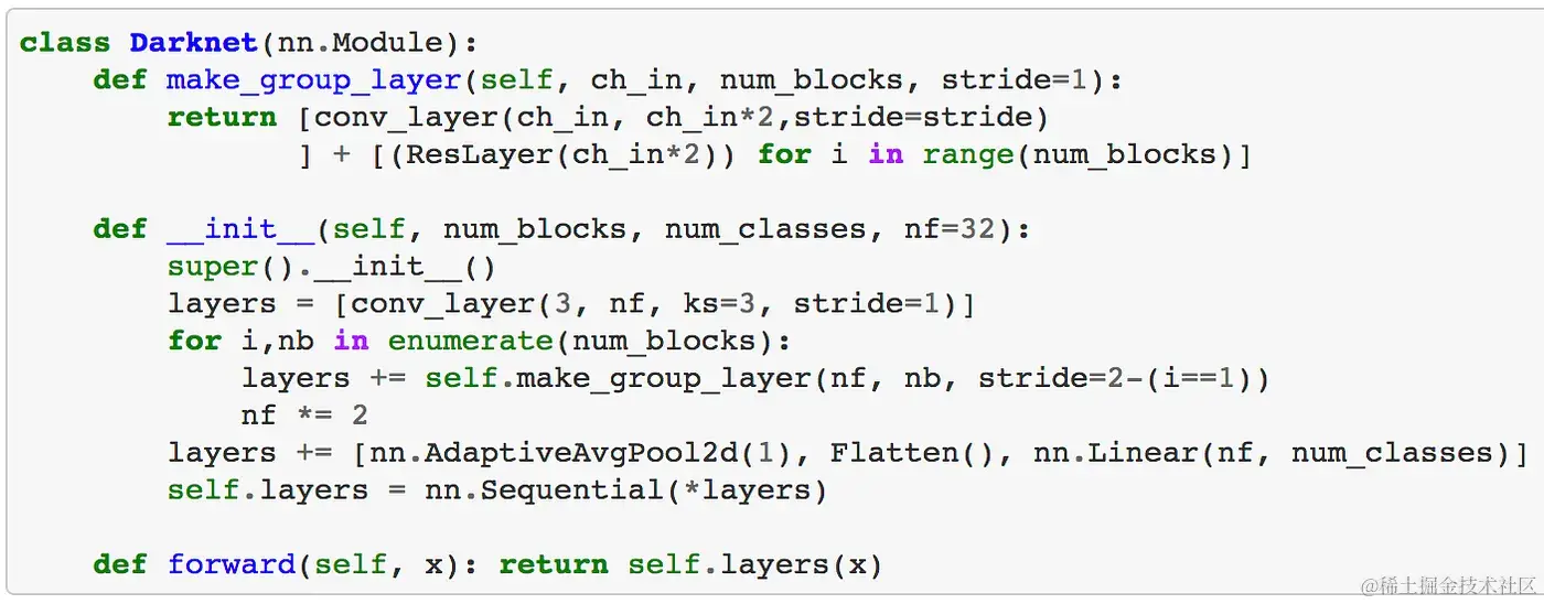 你会注意到我们在conv_layer中没有定义 PyTorch 模块,我们只是使用nn.Sequential[14:07]。如果你阅读其他人的 PyTorch 代码,你会发现这是一个被低估的东西。人们倾向于将一切都写成 PyTorch 模块,带有__init__和forward,但如果你想要的只是一系列按顺序排列的东西,将其作为Sequential会更简洁易懂。