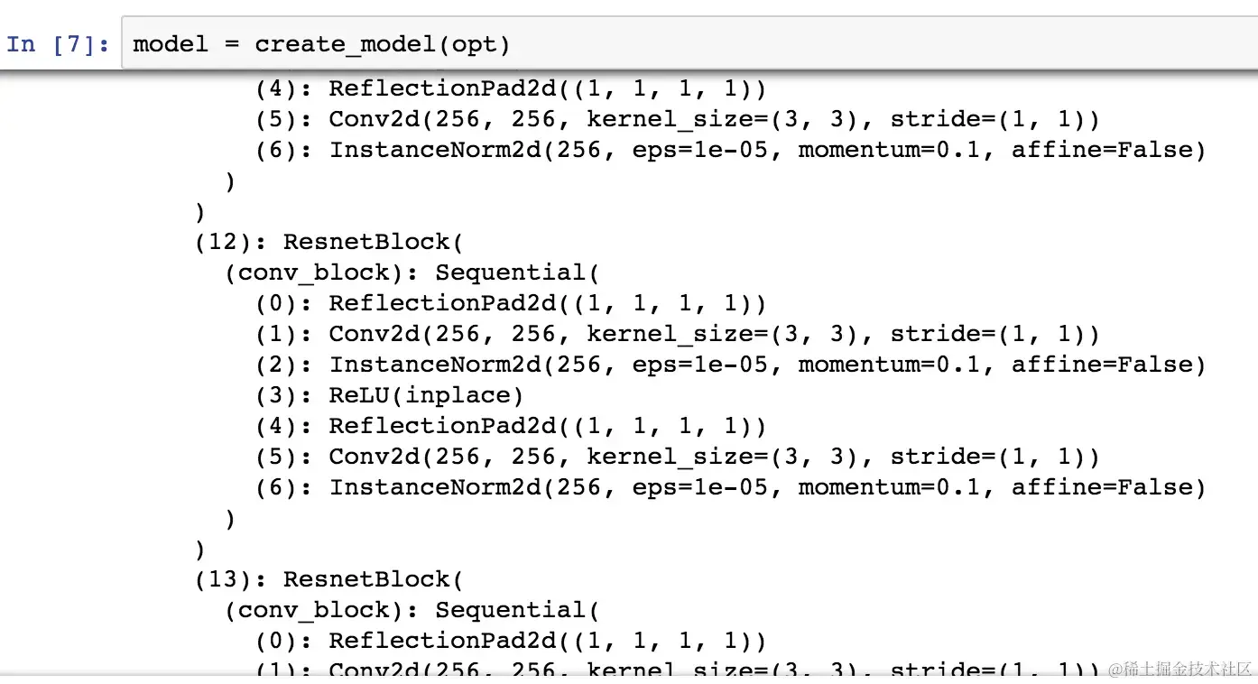 然后打印出并向我们展示我们拥有的 PyTorch 模型。看到他们正在使用 ResNets,你会发现 ResNets 看起来非常熟悉,所以我们有卷积、批量归一化、Relu。InstanceNorm基本上与批量归一化相同,但它是针对一幅图像应用的,区别并不特别重要。你可以看到他们正在做反射填充,就像我们一样。当你尝试像这样从头开始构建所有东西时,这是很多工作,你可能会忘记 fast.ai 自动为你做的一些好事。你必须手动完成所有这些工作,最终只能得到其中的一部分。所以随着时间的推移,希望很快,我们将把所有这些 GAN 内容整合到 fast.ai 中,这将变得简单而容易。