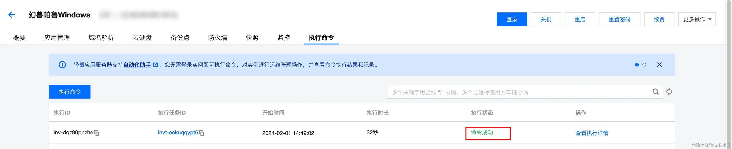 1、登录轻量云控制台,点击你想要更新幻兽帕鲁的 Windows 服务器,进入详情页,并找到“执行命令”。