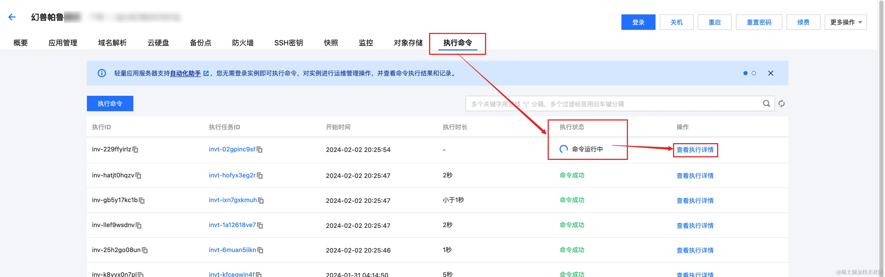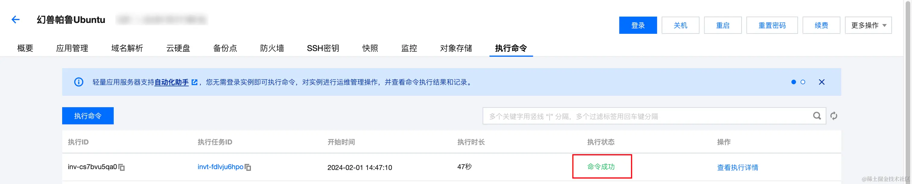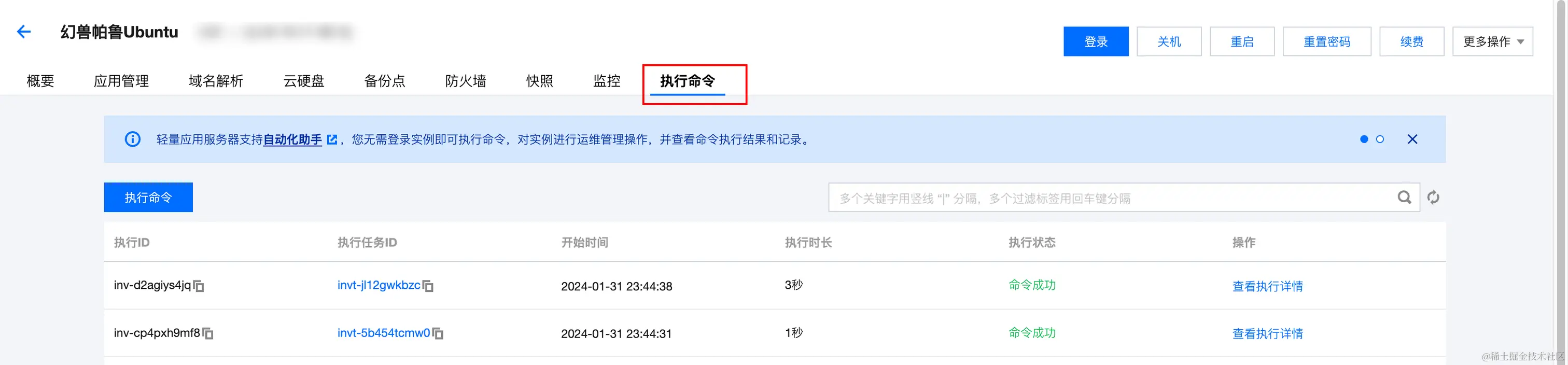 1、登录轻量云控制台,点击你想要更新幻兽帕鲁的 Linux(Ubuntu) 服务器,进入详情页,并找到“执行命令”。